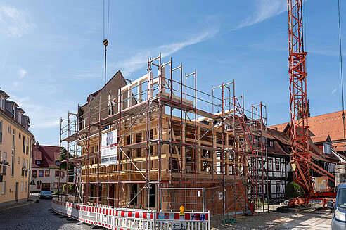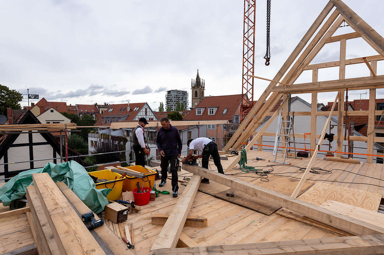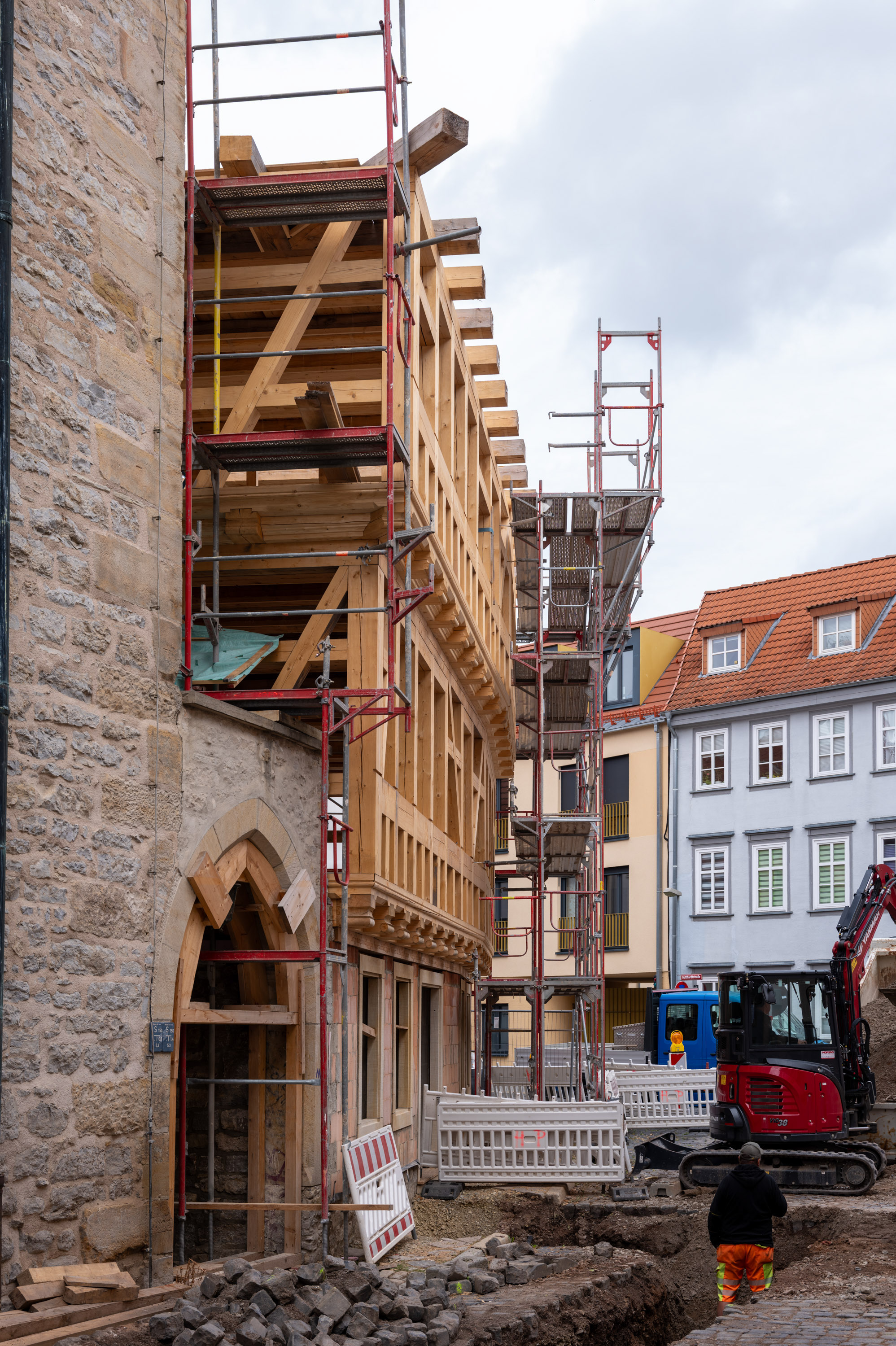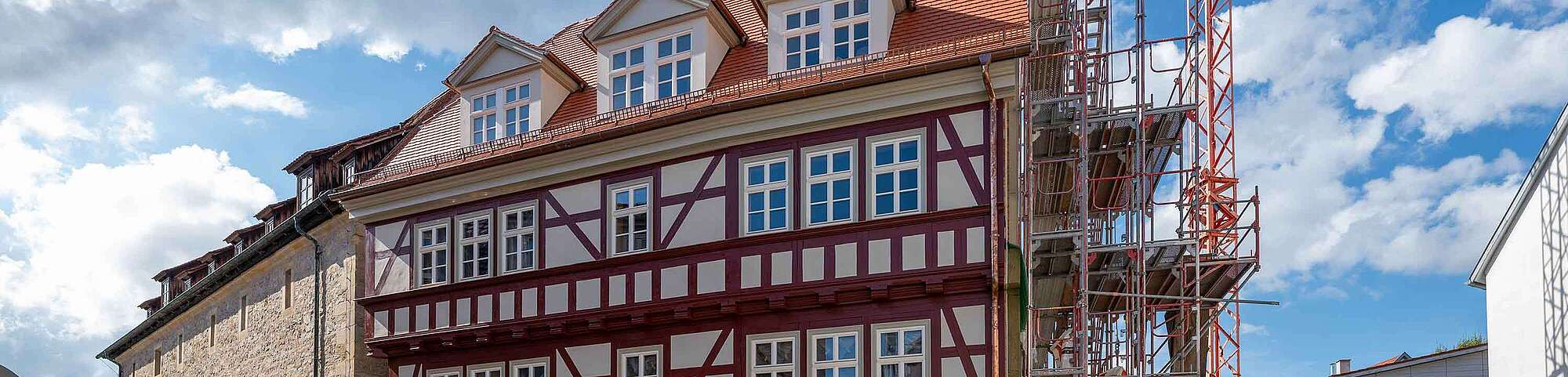 „Nach dem Vorbild der Erfurter Renaissance wurde hier historische Bauweise und Gestaltung mit modernem Wohnkomfort verbunden“, heißt es in der Jury-Begründung. Das Erdgeschoss erhielt Sandsteineinfassungen an Fenstern und Türen, während die oberen Geschosse als echte Fachwerkkonstruktion mit Auskragung und profilierten Balkenköpfen ausgeführt wurden.