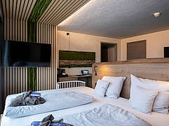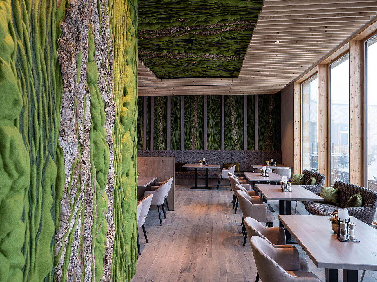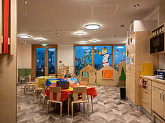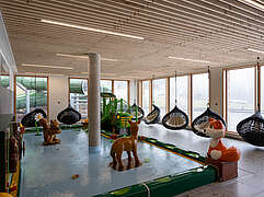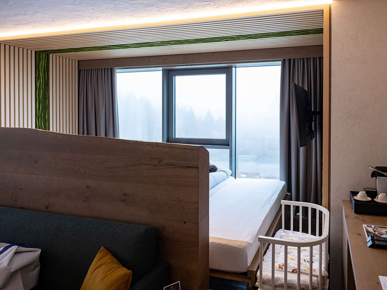 Während der Fototage im Grand Green konnte ich mich frei durch das gesamte Haus bewegen. Vom großzügigen Eingangsbereich über die liebevoll gestalteten Familienzimmer bis hin zu den gemeinschaftlichen Bereichen und den Außenanlagen ließ sich jede Perspektive in Ruhe erkunden. Das natürliche Licht, das durch große Fensterflächen in die Räume fällt, spielte dabei eine zentrale Rolle. Es modelliert die Architektur, lässt Holzoberflächen warm erscheinen und betont die klare Struktur der Räume.