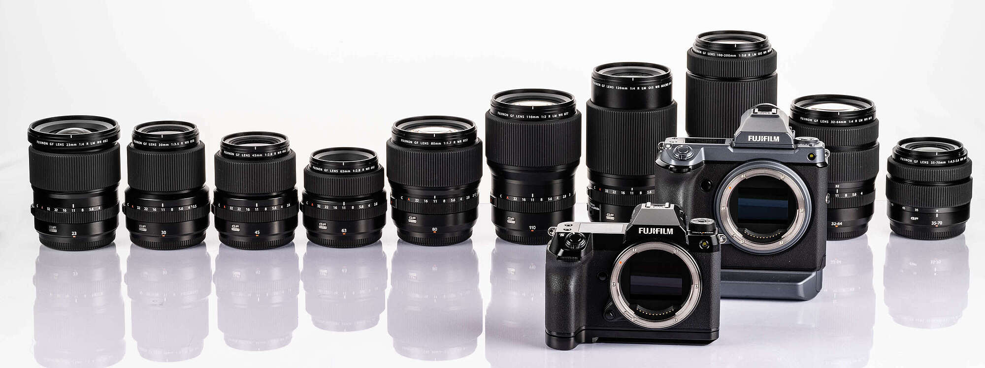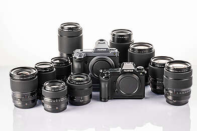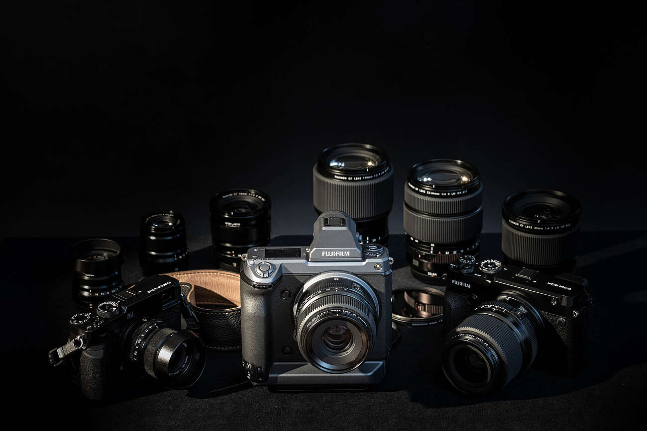 Seit 2023 ist die FUJIFILM GFX100 II mit einem 43.8mm×32.9mm Sensor GFX 102MP CMOS II HS mit Primärfarbfilter hinzugekommen.