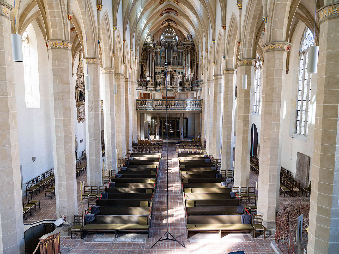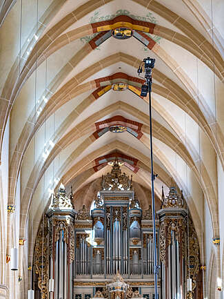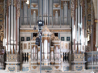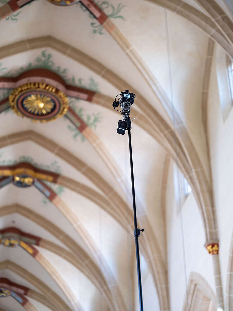 Mit dem transportablen Hochstativ mit einer Höhe von 720 cm ist das ganz anders. Dieses Stativ kann überall dort hin mitgenommen werden, wo man als Fotograf auch stehen kann, in Räumen und auch im freien.